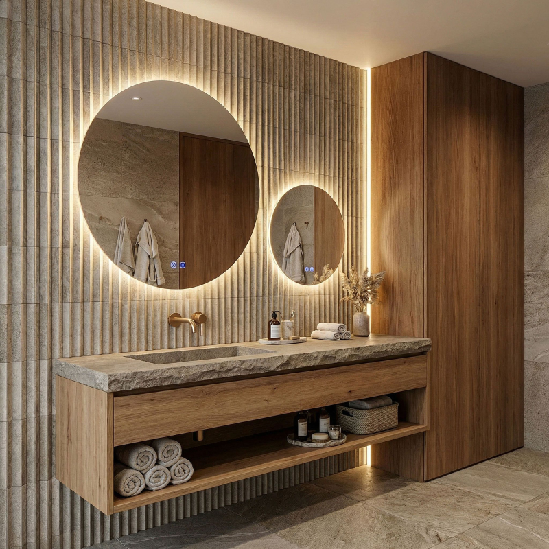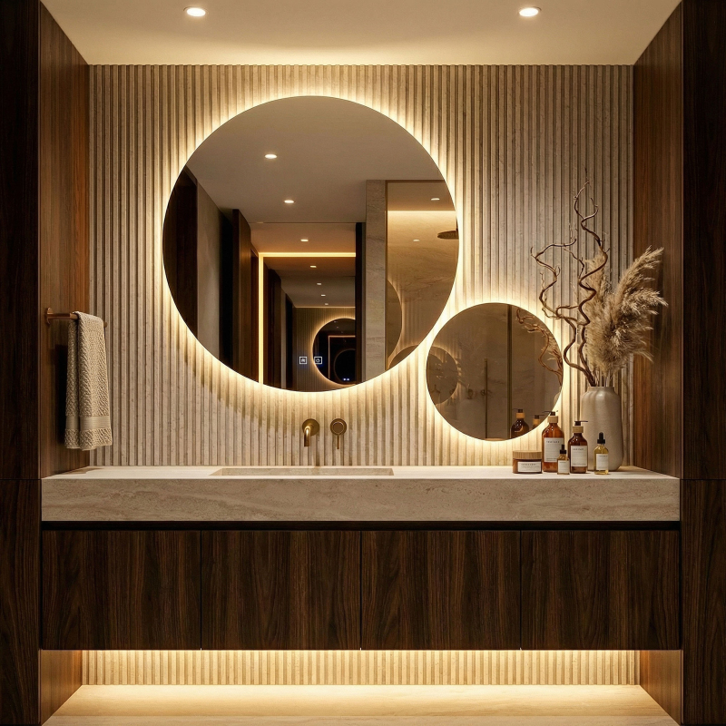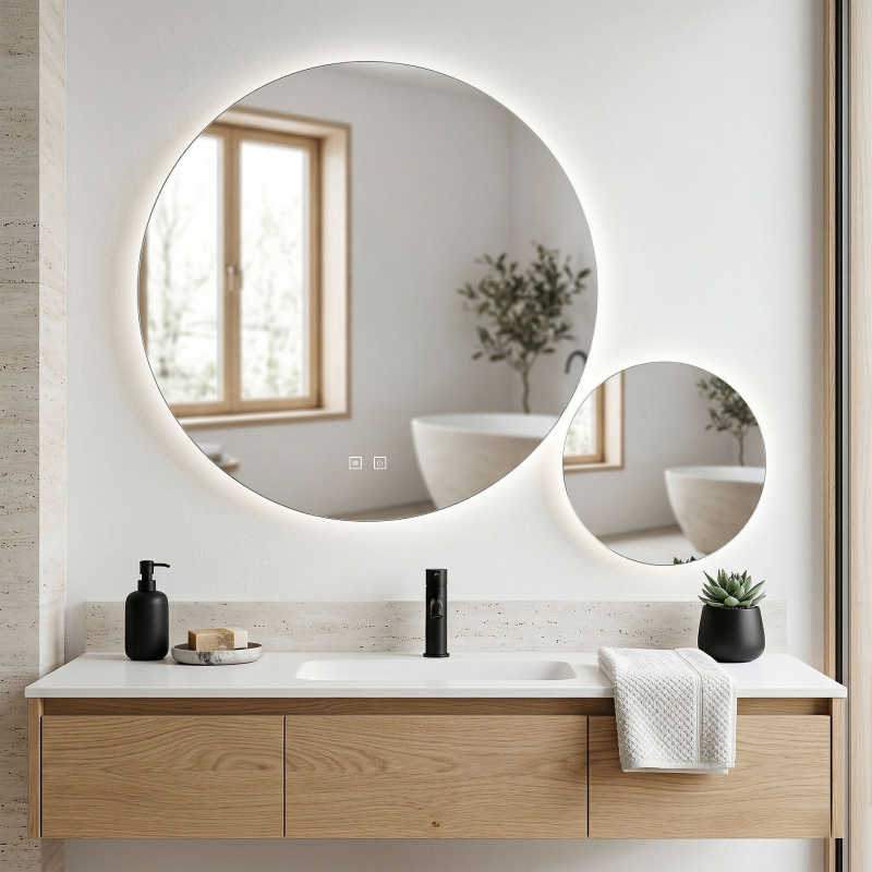 Oceňte eleganci a modernost ve své koupelně díky unikátnímu řešení, jakým je sada dvou kulatých LED koupelnových zrcadel značky REA. Tato inovativní a stylová kombinace umožňuje vytvořit jedinečnou nástěnnou aranžaci, která okouzlí každého uživatele. Podsvícená zrcadla vyrobená z nejkvalitnějších materiálů nejen opticky zvětší prostor, ale také zajistí spolehlivost a dostatek světla při každodenních pečujících rituálech.Dvě zrcadla v sadě – hlavní velké zrcadlo s ovládacím panelem a menší zrcadlo, které můžete volně naaranžovat vedle něj a vytvořit tak unikátní kompozici přizpůsobenou vašemu interiéru.3D efekt a lehkost prostoru – speciální konstrukce se skrytým kruhem a LED pásky způsobuje, že zrcadla nepřiléhají přímo ke stěně, a dodává koupelně moderní trojrozměrný vzhled.Tři barvy světla na výběr – plynulá změna mezi teplým, neutrálním a studeným odstínem umožňuje dokonale přizpůsobit osvětlení obou zrcadel denní době nebo vašim preferencím.Intuitivní dotykové ovládání – tlačítko na velké ploše umožňuje pohodlné zapnutí, volbu barvy světla i plynulé ztmavení a zesvětlení intenzity svícení.Praktická funkce Anti-Fog – speciální druhé tlačítko na hlavním zrcadle spouští topnou podložku, která zabraňuje zamlžování povrchu i během horkých koupelí a zaručuje křišťálově čistý odraz.Pohodlné napájení – sada je vybavena klasickým kabelem se zástrčkou do zásuvky, což zajišťuje rychlou a bezproblémovou instalaci bez nutnosti upravovat domácí elektroinstalaci. Moderní sada podsvícených zrcadel REA je volbou pro ty, kteří si cení maximálního komfortu a neotřelého designu. Dokonalé v každém detailu, elegantní zpracování a mimořádná funkčnost budou skutečnou ozdobou vaší koupelny. Díky pevné konstrukci, snadné montáži a záruce kvality si můžete být jisti, že vám budou sloužit dlouhá léta a každý den poskytovat pohodlí.