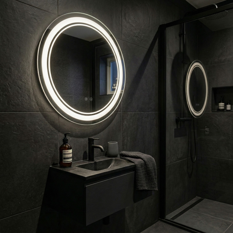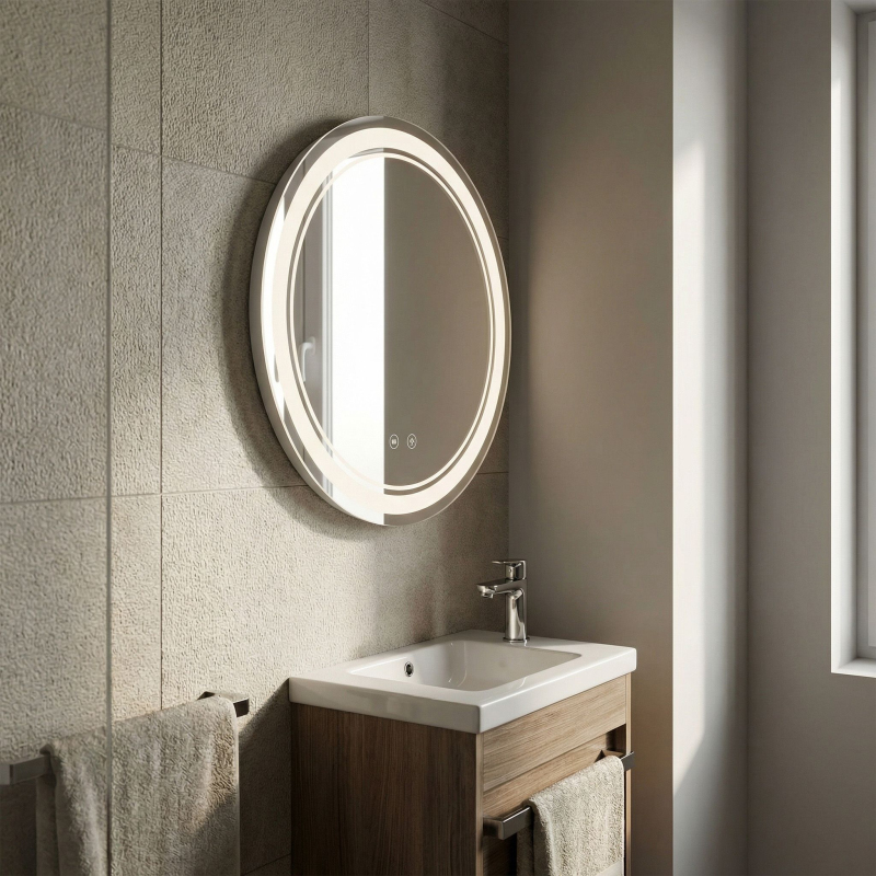 Hledáte výjimečný akcent, který dodá vašemu interiéru jemný jas? Ocňte eleganci a modernost ve své koupelně díky kulatému LED zrcadlu Soft 50 cm. Je to ideální spojení minimalistického stylu a náladové funkčnosti, které nadchne každého uživatele hledajícího dekorativní řešení. Vyrobeno z vysoce kvalitních materiálů, kulaté zrcadlo nejen opticky zvětší prostor, ale vnese do něj útulnou atmosféru.Dekorativní dvojitý světelný rám – unikátní design se dvěma světelnými obručemi vytváří náladový vizuální efekt, ideální jako doplňkové osvětlení.Jemný výkon svícení – osvětlení navržené s ohledem na ozdobnou funkci, které jemně rozjasňuje plochu i stěnu, aniž by oslňovalo oči.Intuitivní dotykový spínač – diskrétní senzor umístěný v ploše skla umožňuje pohodlné ovládání nálady ve vaší koupelně.Integrovaná vyhřívací podložka (Anti-Fog) – zabraňuje mlžení zrcadla, což zaručuje jasný odraz i po horké koupeli.Moderní kulatá forma – jemné linie a průměr 50 cm dělají zrcadlo ideálním pro jakýkoli, i menší prostor.Vysoká kvalita skla – precizní zpracování zaručuje odolnost a rezistenci vůči specifickým podmínkám v koupelnie.Kulaté LED zrcadlo Soft 50 cm je vynikající volbou pro lidi, kteří oceňují náladový design a šperkové detaily v interiéru. Dokonalé v každém detailu, stane se stylovou ozdobou, která večer promění vaši koupelnu v relaxační zónu.
