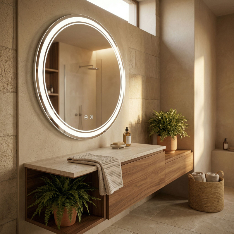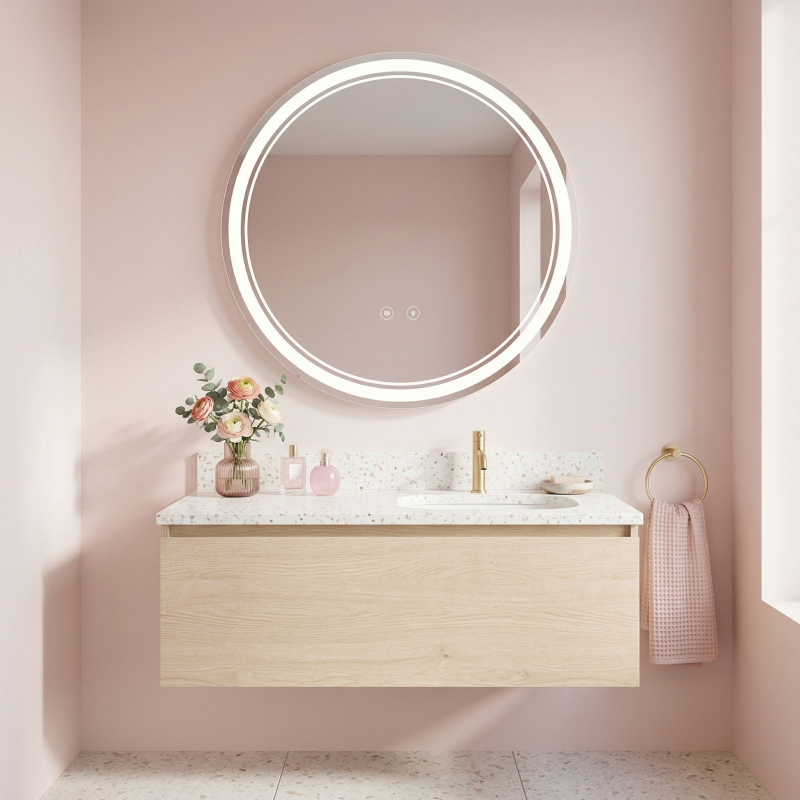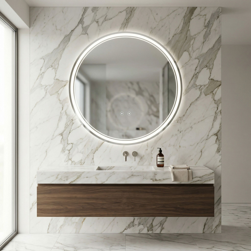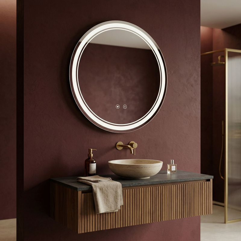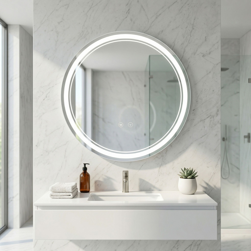 Hledáte spektakulární akcent, který dodá vašemu interiéru jemný jas a luxusní šmrnc? Oceňte eleganci a modernost ve své koupelně díky kulatému LED zrcadlu Soft 90 cm. Je to ideální spojení minimalistického stylu a náladové funkčnosti, vytvořené pro uživatele hledající dekorativní řešení prémiové třídy. Imponující průměr 90 cm dělá ze zrcadla hlavní bod aranžmá, který opticky zvětší i velké prostory.Dekorativní dvojitý světelný rám – unikátní design se dvěma světelnými obručemi vytváří náladový vizuální efekt a tvoří šperkový prvek ve vaší koupelně.Jemný výkon svícení – osvětlení navržené s ohledem na ozdobnou funkci, které jemně rozjasňuje plochu i stěnu a vytváří ideální klima pro večerní relaxaci.Intuitivní dotykový spínač – diskrétní senzor umístěný v ploše skla umožňuje pohodlné ovládání nálady jedním dotykem.Integrovaná vyhřívací podložka (Anti-Fog) – zabraňuje mlžení zrcadla, což zaručuje jasný odraz i po dlouhé, horké koupeli.Monumentální kulatá forma – velký průměr 90 cm dodává interiéru prestižní charakter a dokonale vyplňuje prostor nad širokými umyvadlovými skříňkami.Vysoká kvalita skla – precizní zpracování a materiály odolné proti korozi zaručují dlouhou životnost a neměnný vzhled po mnoho let.