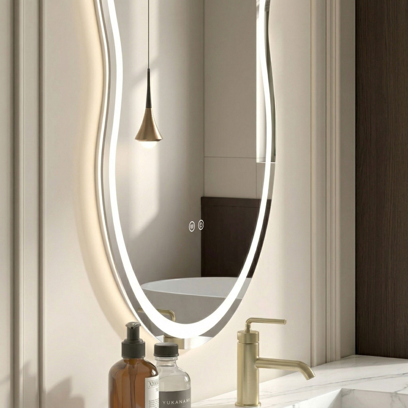 Organické LED zrcadlo s neutrálním podsvícením je spojením moderního designu a praktické technologie, které promění každou koupelnu. Jeho asymetrická, měkká linie dokonale zapadá do nejnovějších interiérových trendů a vestavěný osvětlovací systém zaručuje nejvyšší komfort při každodenní péči.Přirozená barva světla (Neutral White) – zrcadlo vyzařuje světlo v neutrální barvě, která se nejvíce blíží dennímu světlu. Jde o ideální řešení pro líčení i každodenní péči, protože zajišťuje věrné podání barev bez namáhání zraku.Funkce stmívání a zesvětlení – integrovaný stmívač umožňuje plynulou regulaci intenzity světla, což dovoluje vytvořit v koupelně relaxační atmosféru nebo dosáhnout plného jasu při přesných činnostech.Funkce vyhřívání (Anti-Fog) – zapomeňte na zamlženou plochu po horké koupeli. Vyhřívací systém zabraňuje usazování vodní páry na povrchu zrcadla a zajišťuje dokonale čistý odraz za všech podmínek.Podsvícený dotykový vypínač – elegantní dotykový panel umístěný přímo v ploše zrcadla umožňuje intuitivní ovládání funkcí. Aktivita dané funkce je signalizována decentním modrým podsvícením tlačítka.Efektní světelná záře – mléčný difuzor na okrajích plochy vytváří měkké, rovnoměrně rozptýlené světlo, které neoslňuje oči a vytváří působivou světelnou záři na stěně.Volbou inteligentního LED zrcadla získáváte produkt, který spojuje šperkovou ozdobu interiéru s praktickými funkcemi. Je to ideální volba pro ty, kteří hledají moderní řešení usnadňující každodenní život.