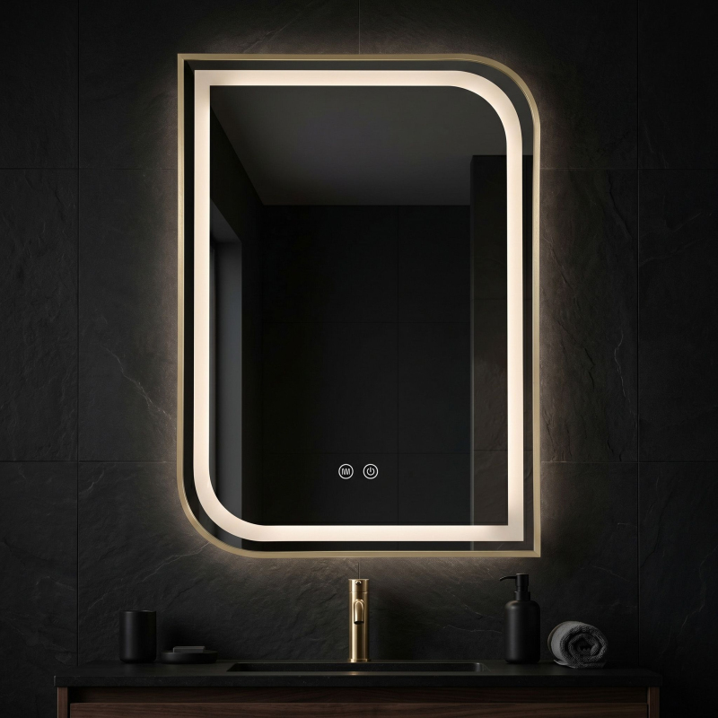 Hledáte prvek, který spojí šperkový lesk s nejmodernější technologií? Objevte koupelnové LED zrcadlo Zone 70×50 cm v elegantním zlatém rámu. Tento model s unikátním asymetrickým tvarem boří stereotypy a dodává interiéru luxusní charakter. Vyrobeno s nejvyšší péčí o detaily, stane se centrálním bodem vaší koupelny a nabídne nejen perfektní odraz, ale i náladové osvětlení.Elegantní zlatý rám – jemný kartáčovaný povrch rámu dodává interiéru prestiž a dokonale ladí se zlatou armaturou ve stylu Glamour nebo Modern Classic.Unikátní tvar se zaoblenými rohy – asymetrická linie (dva rohy pravé, dva zaoblené) dodává zrcadlu moderní designový šmrnc.Vnitřní LED rám – integrovaný světelný pás umístěný pod sklem vyzařuje jasné, rozptýlené světlo, ideální pro každodenní péči.Funkce stmívání – dotykové tlačítko umožňuje plynulou regulaci intenzity světla od funkčního osvětlení po relaxační přítmí.Systém Anti-Fog (Proti zamlžování) – vestavěná vyhřívací podložka zabraňuje mlžení střední části zrcadla i po horké koupeli.Intuitivní dotykové ovládání – moderní senzory ve spodní části umožňují pohodlné zapnutí osvětlení a funkce vyhřívání jedním dotykem.Bezpečná a odolná konstrukce – vysoce kvalitní materiály odolné proti vlhkosti zaručují spolehlivost po dlouhá léta.