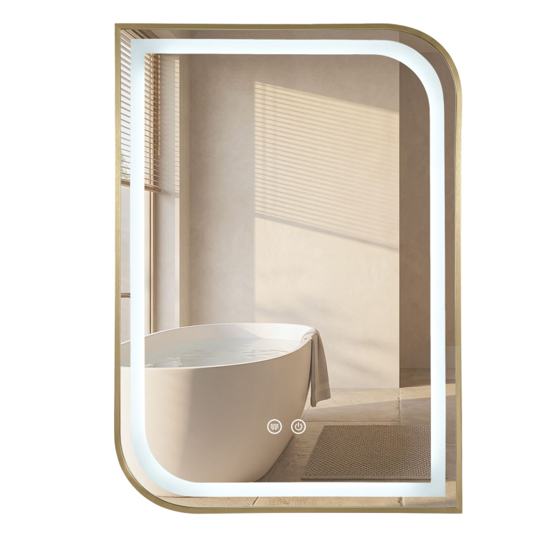 Chcete do své koupelny vnést prvek, který upoutá pozornost a definuje luxusní charakter interiéru? Poznejte LED zrcadlo Zone o rozměru 80×60 cm, zasazené v ušlechtilém zlatém rámu. Je to nabídka pro odvážné estety – asymetrická forma spojující geometrickou disciplínu s měkkými oblouky vytváří na stěně skutečné dílo užitého umění, které opticky zvětší prostor.Ušlechtilý zlatý povrch – rám v odstínu kartáčovaného zlata tvoří šperkový doplněk plochy, který dokonale ladí s luxusními doplňky.Designová asymetrie – unikátní spojení pravých úhlů s jemně zaoblenými rohy dodává zrcadlu lehkost.Inteligentní stmívání – díky pokročilé funkci regulace jasu můžete libovolně ovládat náladu – od intenzivního ranního světla po jemnou večerní záři.Technologie Anti-Fog (Antipára) – vestavěný systém vyhřívání zaručuje křišťálově čistou plochu i po intenzivní horké koupeli.Efektní světelný rám – LED pásek ukrytý pod plochou vyzařuje měkké, neutrální světlo, které dokonale osvětluje tvář bez stínů.Senzorické ovládání – dvě diskrétní, podsvícená dotyková tlačítka zajišťují okamžitou reakci a plnou kontrolu nad funkcemi zrcadla.Odolnost třídy Premium – plocha odolná proti korozi a solidní konstrukce rámu jsou zárukou neměnného vzhledu po mnoho let.