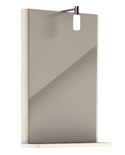Obdélníkové zrcadlo s osvětlením s poličkou o rozměru 38,3x60,5 cm. Rám zrcadla v bílé barvě. Orientace zrcadla na výšku.