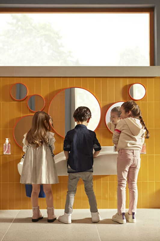 Zrcadlo o průměru 20 cm s oranžovým okrajem, který dodá dětské koupelně na atraktivnosti.