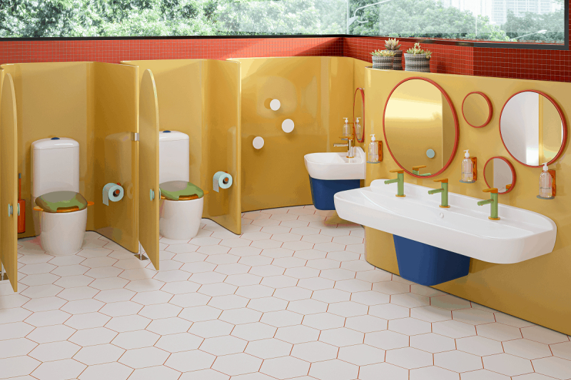 Zrcadlo o průměru 60 cm s oranžovým okrajem, který dodá dětské koupelně na atraktivnosti.