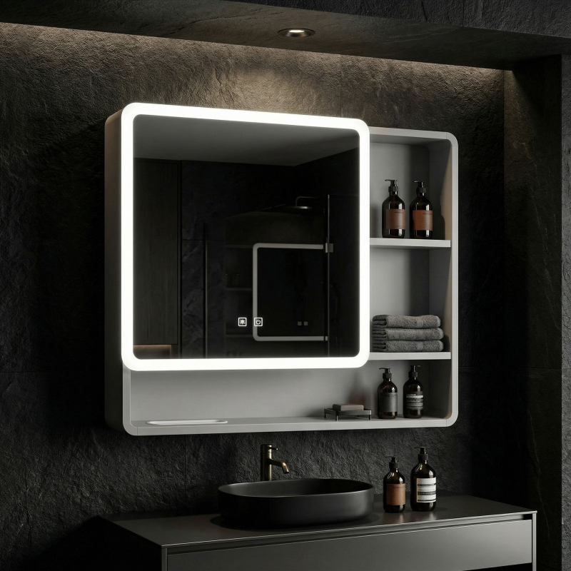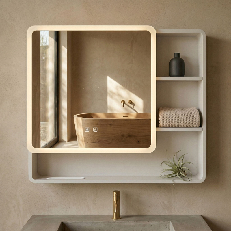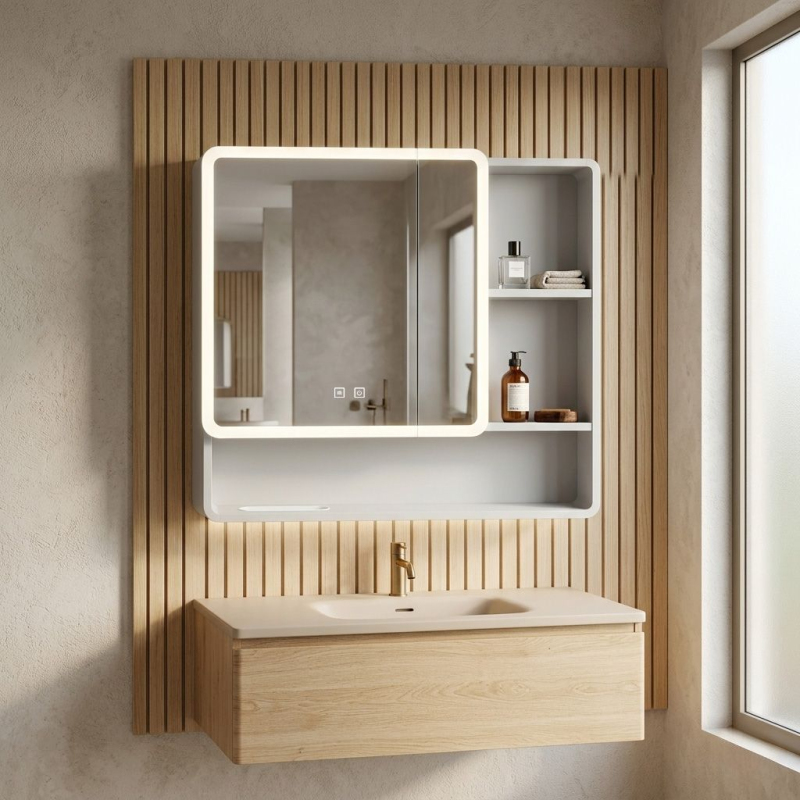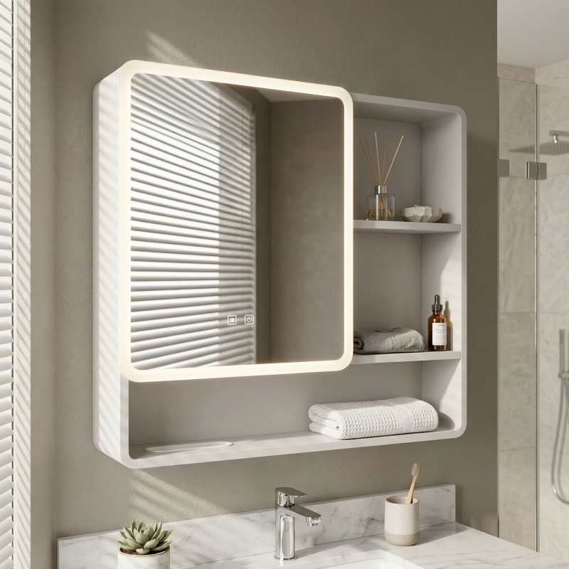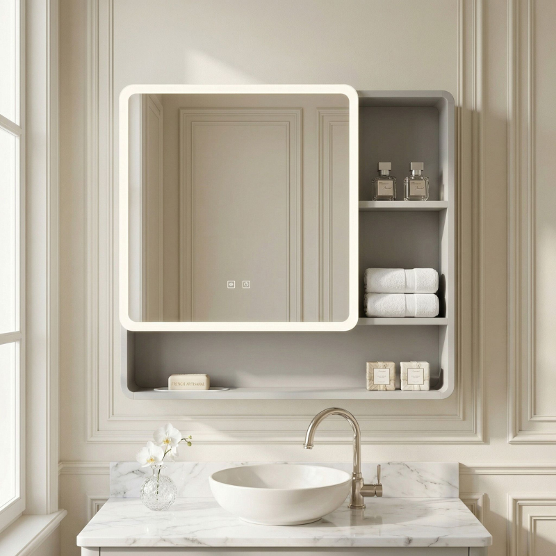 Objevte novou úroveň organizace ve své koupelně díky koupelnové skříňce s LED zrcadlem M1016-70. Tato moderní konstrukce o rozměrech 70×65 cm je ideálním spojením funkčnosti, technologie a minimalistického designu. Skříňka vyrobená z materiálů s vysokou odolností proti vlhkosti nejen opticky zvětší prostor, ale poskytne inteligentní úložné místo pro všechny vaše nezbytné doplňky.Integrované LED osvětlení – pískovaný rám kolem zrcadlové plochy vyzařuje rovnoměrné světlo, které ideálně osvětluje obličej při každodenní péči.Vnitřní háčky na dvířkách – unikátní systém pěti háčků namontovaných na vnitřní straně frontu umožňuje pohodlné zavěšení drobných doplňků, jako jsou gumičky do vlasů nebo štětce.Skrytý hranový úchyt – speciálně profilovaný výřez v dolní části rámu zrcadla umožňuje komfortní otevírání skříňky bez zanechávání otisků prstů na skle.Praktický systém polic – promyšlené rozdělení interiéru a otevřené boční police zajišťují rychlý přístup k nejčastěji používané kosmetice a parfémům.Vyhřívací podložka (Anti-Fog) – vestavěný systém zabraňuje mlžení zrcadla, což zaručuje okamžitou viditelnost i přímo po horké sprše.Podsvícený dotykový spínač – intuitivní senzory v zrcadle umožňují snadné ovládání osvětlení a funkce odmlžování jedním dotykem.Odolná konstrukce z plastu – lehké a pevné tělo je zcela odolné proti korozi, vodní páře a přímému kontaktu s vodou.