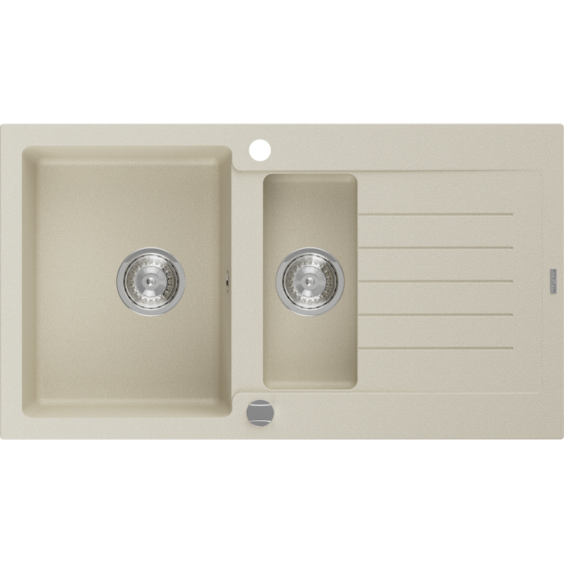 Specifikace produktu: Rozměr: 900x505x200 mm Hloubka dřezu: 180 mm (větší), 115 mm (menší) Rozměry dřezu: 435x335 mm (větší), 345x150 mm (menší) Průměr odtoku: ø90 mm Typ: 1,5dílná dřez s krátkým odtokem Typ: Vestavný Materiál: Žula Barva: Béžová Povrchová úprava sifonu: Chrom Přepadový otvor: Ano Otvor pro baterii: Ano Automatický sifon součástí balení Vysoká odolnost proti poškrábání a změně barvy Odolnost vůči teplotním šokům Povrch pro snadné čištění Dva další frézované otvory pro samoděrování ø35